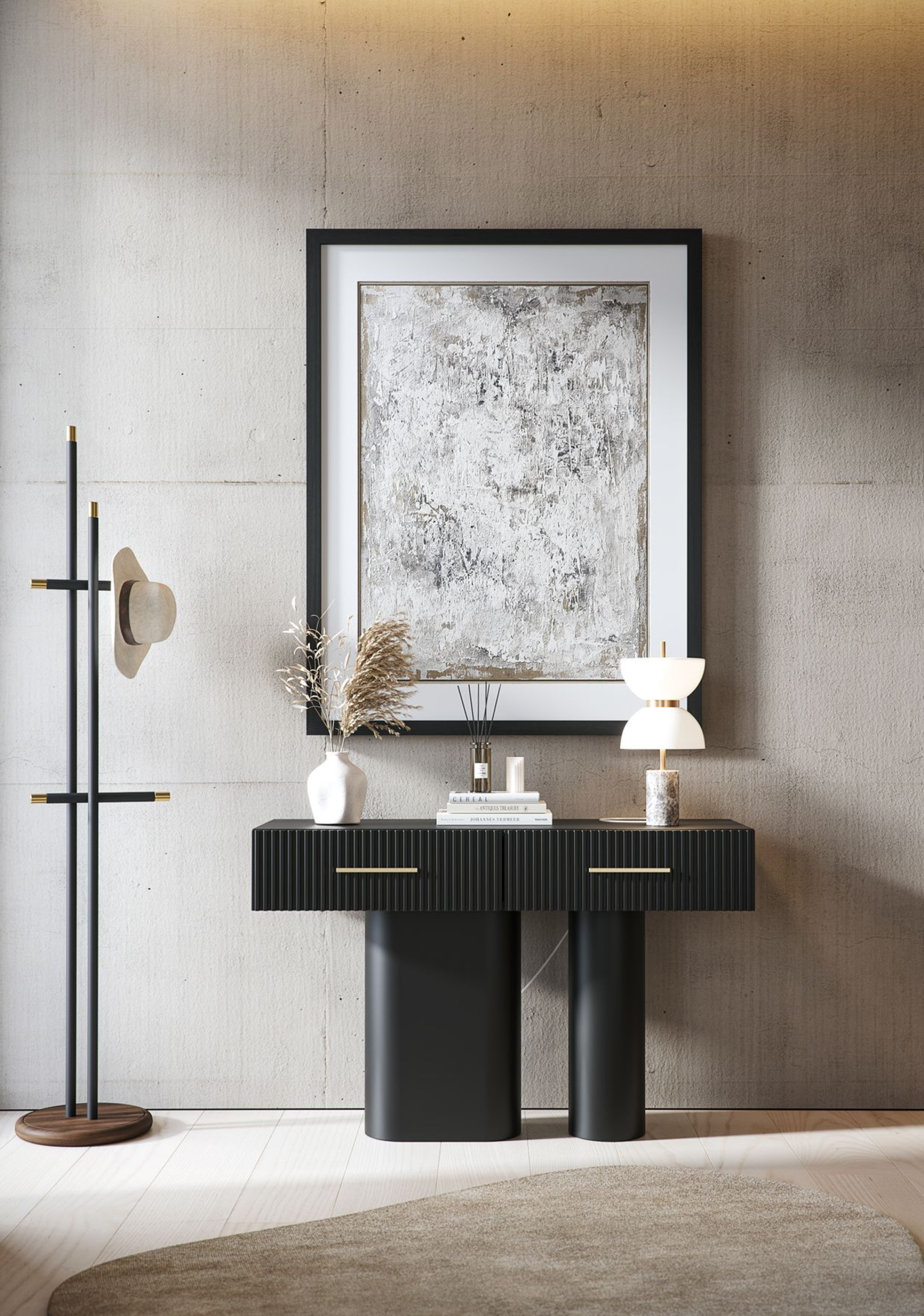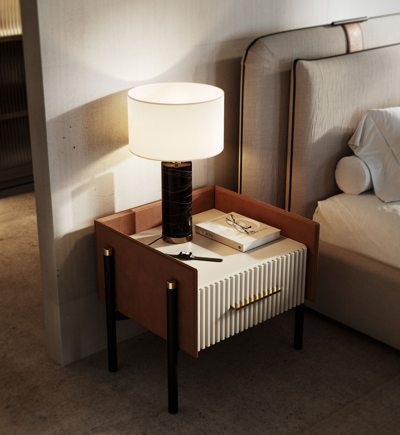Madeira maciça de origem sustentável, mármore, couro genuíno e tecidos texturizados formam a base de um mobiliário que exala qualidade e bom gosto. Acabamentos refinados, como vernizes, detalhes em metal dourado e costuras artesanais, conferem exclusividade e sofisticação a cada detalhe.
