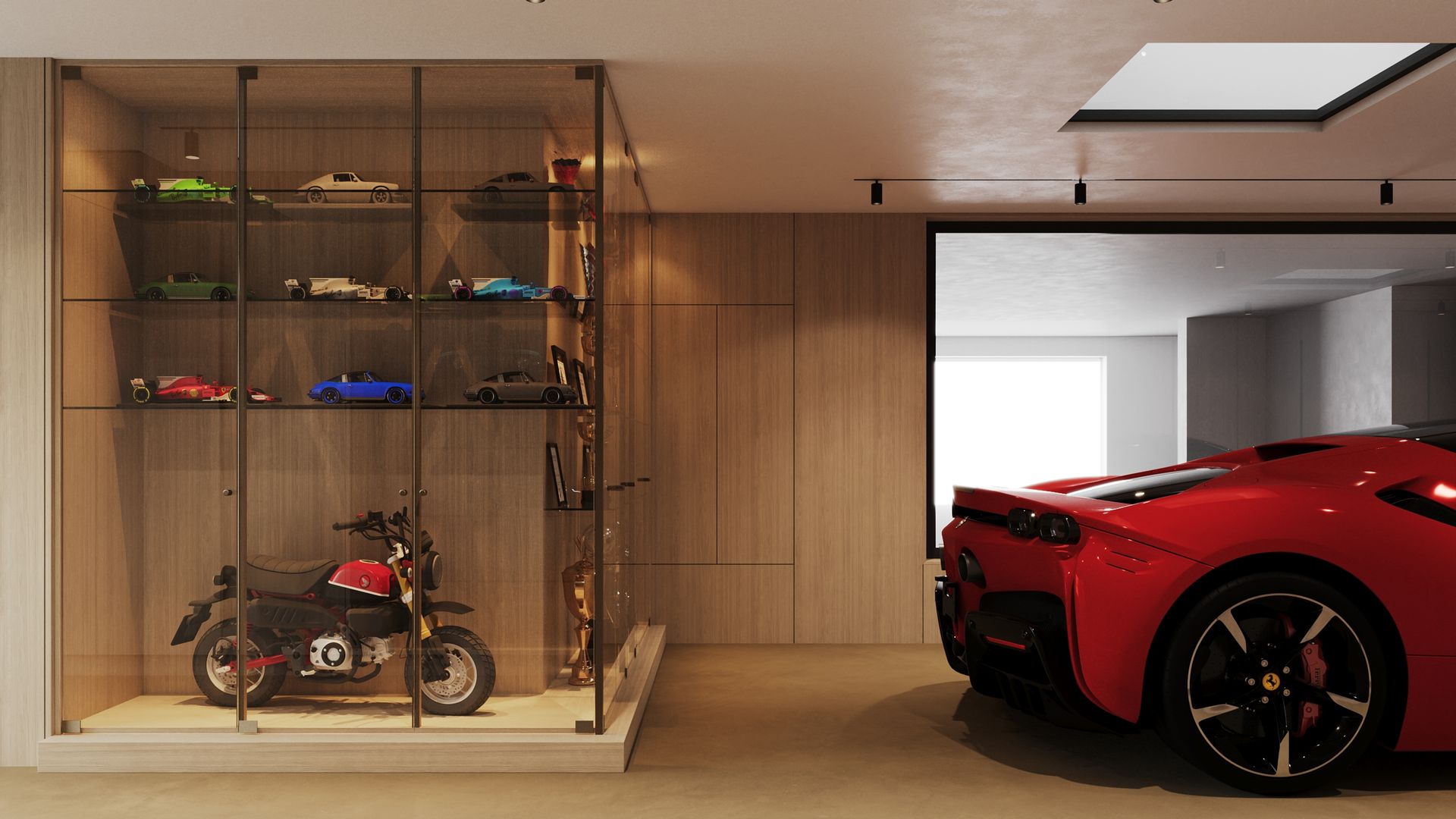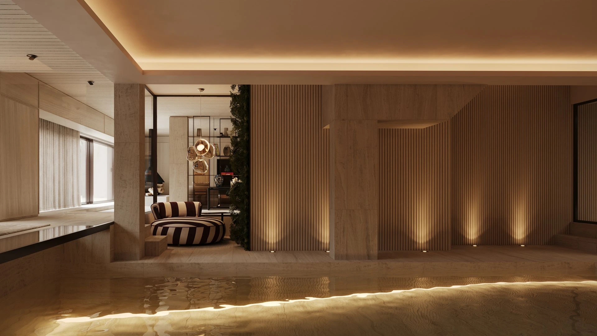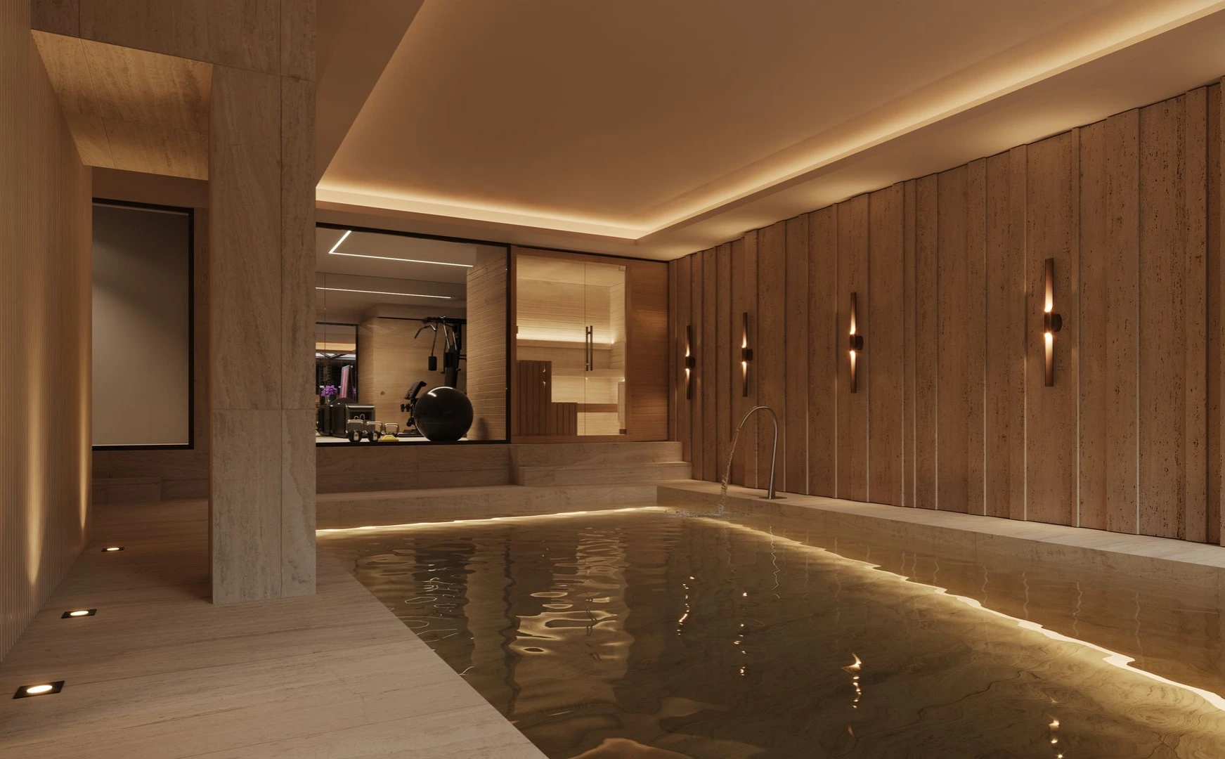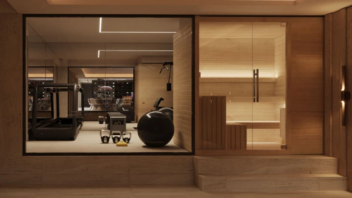 A casa integra ainda espaços dedicados ao lazer e bem-estar, como uma sala de jogos e convívio, uma sala de cinema privada, um ginásio totalmente equipado, e uma piscina interior climatizada, cuja envolvente foi cuidadosamente desenhada para promover uma atmosfera de relaxamento e exclusividade. Complementam o programa um hall de entrada cuidadosamente desenhado, que estabelece desde o primeiro momento a identidade da casa, e uma garagem integrada no projeto, pensada de forma funcional e em sintonia com a linguagem estética global.