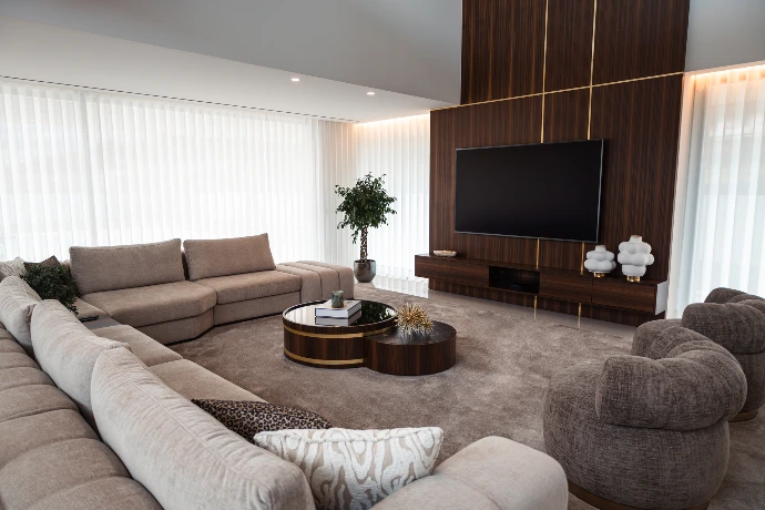 A intervenção incidiu sobre as principais áreas da moradia, nomeadamente a sala de estar, sala de jantar e cozinha open space, onde o desenho do mobiliário foi pensado para otimizar a circulação, a ergonomia e a integração dos espaços. Os materiais, acabamentos e paleta cromática foram cuidadosamente selecionados para criar um ambiente elegante, equilibrado e intemporal.