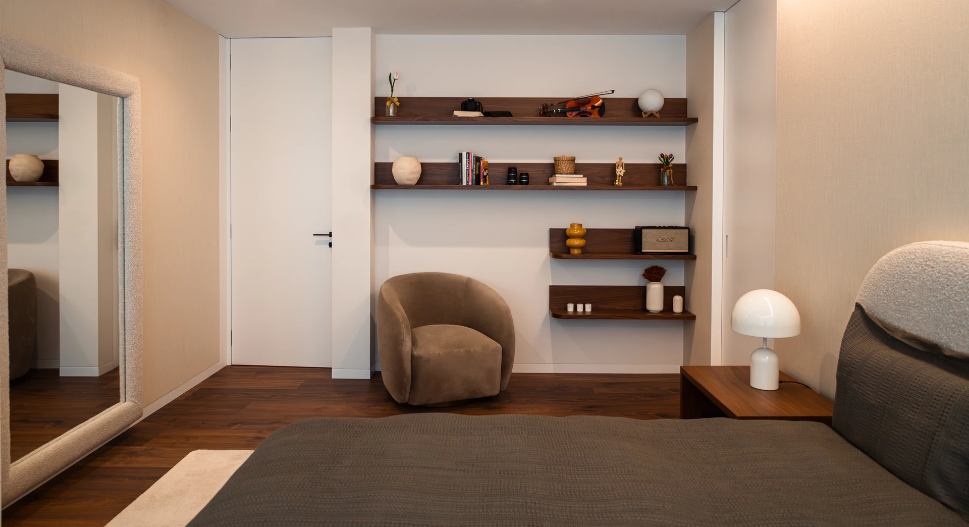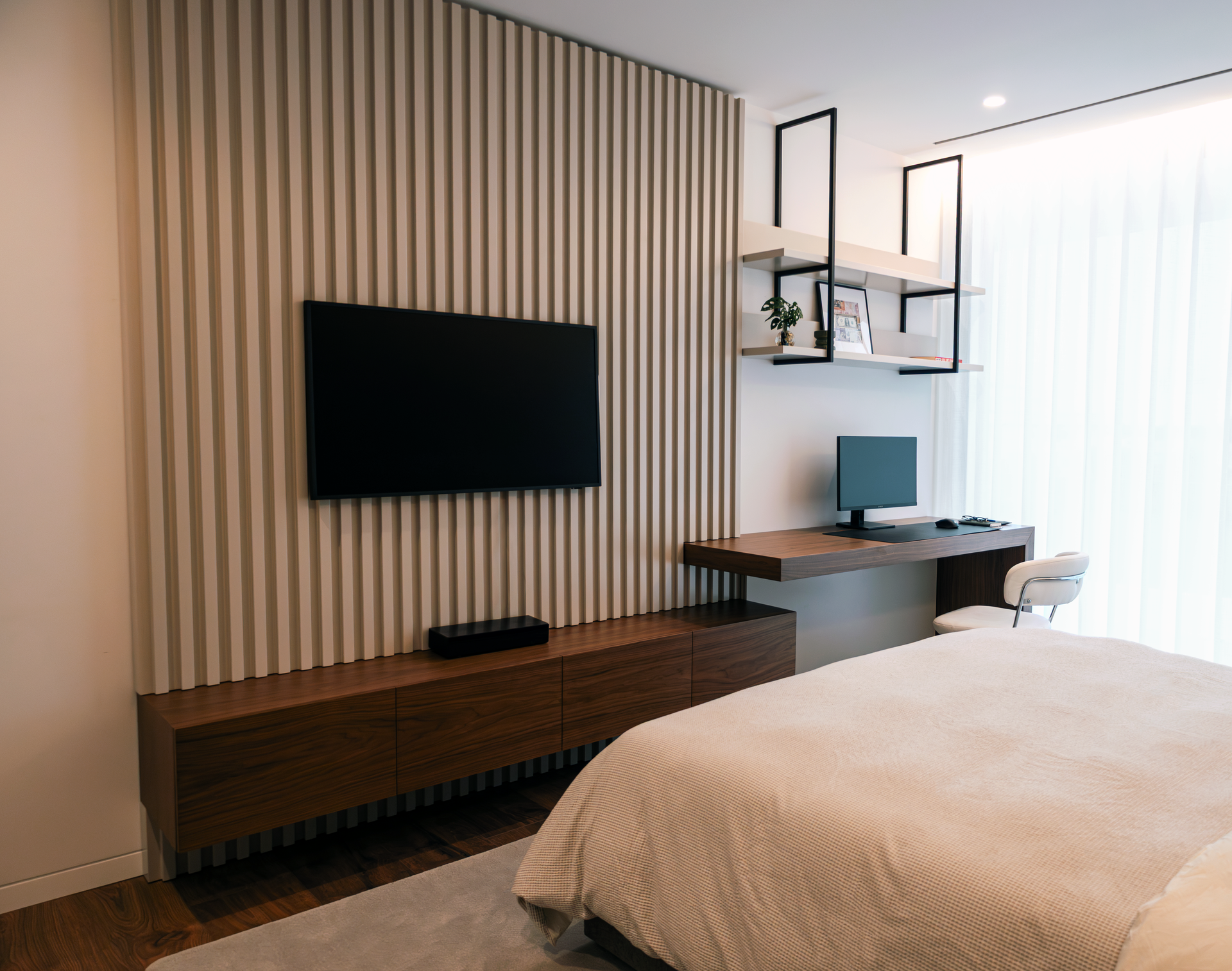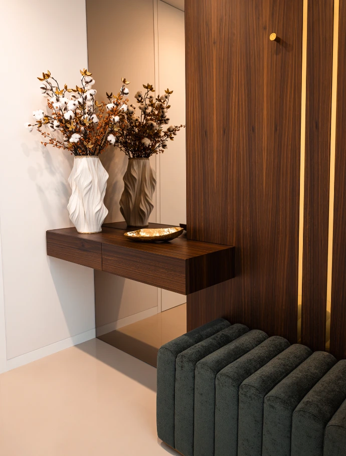 Nas suites, o projeto de interiores privilegiou o conforto e a personalização, com mobiliário desenhado à medida, soluções de arrumação integradas e iluminação pensada para diferentes momentos de uso. O hall de entrada foi concebido como um espaço de transição marcante, refletindo desde o primeiro momento a identidade da moradia. O escritório combina funcionalidade e sofisticação, criando um ambiente propício ao trabalho sem comprometer a estética global da casa.